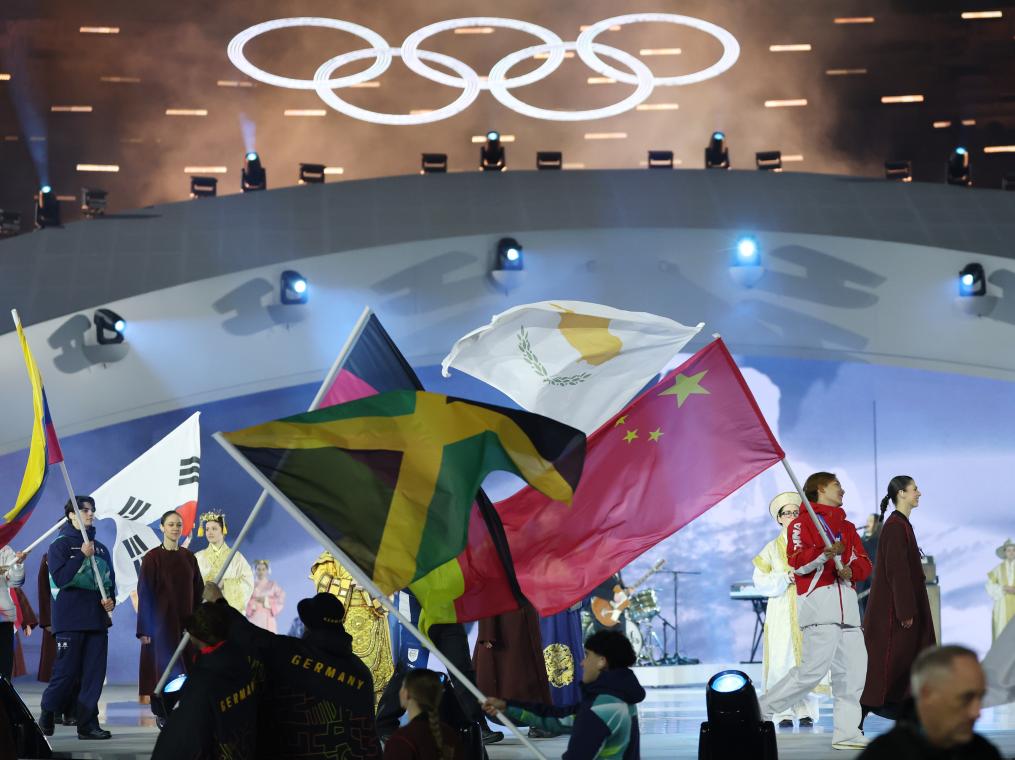 22日、ミラノ・コルティナ冬季五輪の閉会式で入場する各国選手団。(ベローナ=新華社記者/李京)