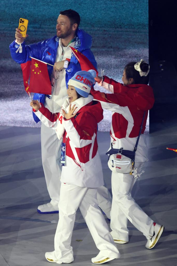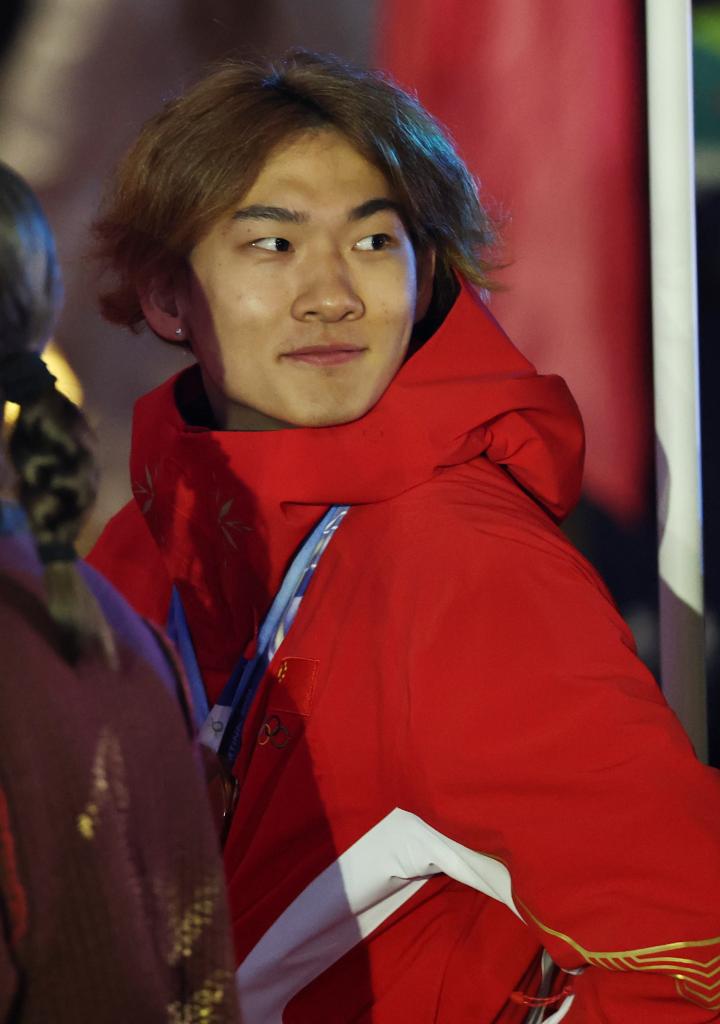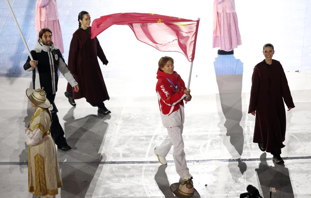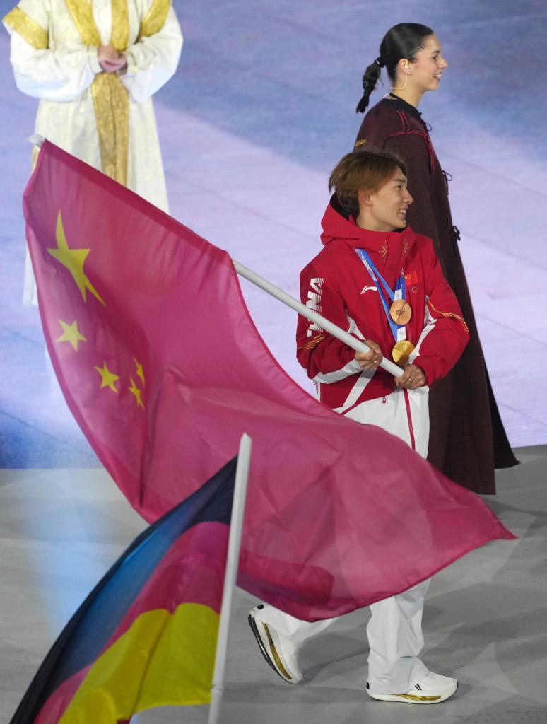 22日、ミラノ・コルティナ冬季五輪の閉会式で中国選手団の旗手を務める蘇翊鳴(そ・よくめい)。(ベローナ=新華社記者/李京)