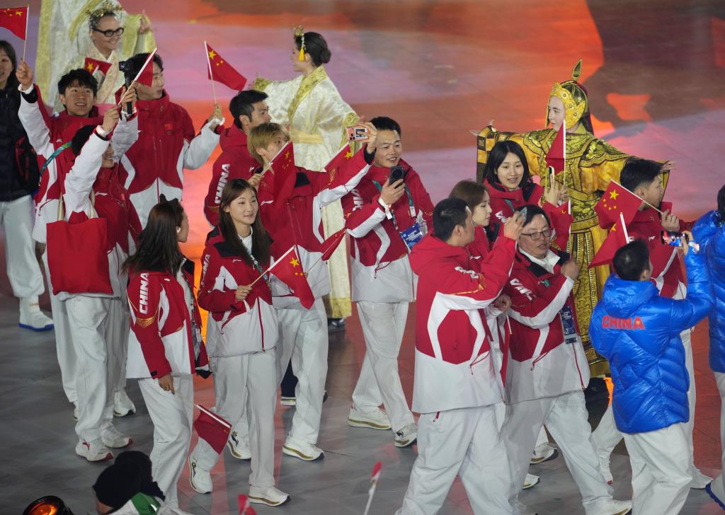 22日、ミラノ・コルティナ冬季五輪の閉会式で入場する中国選手団。(ベローナ=新華社記者/李明)