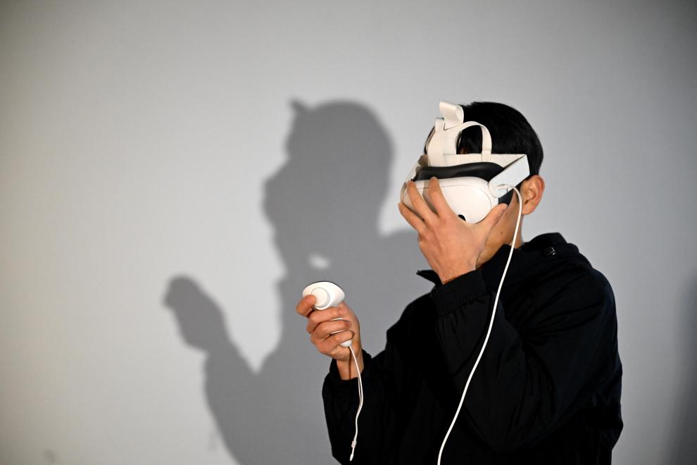 柳州市のロボット産業パークで、拡張現実(AR)ゴーグルを装着し、産業用人型ロボットの作業訓練を行う呉東波さん。(1月30日撮影、柳州=新華社配信/黎寒池)