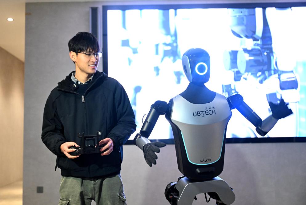 柳州市のロボット産業パークで、リモコンを使って産業用人型ロボットにダンスの動作を指示する呉東波さん。(1月30日撮影、柳州=新華社配信/黎寒池)