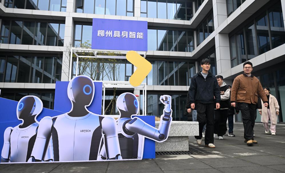 11日、柳州市のロボット産業パークを出るロボット訓練士の呉東波さん(左端)ら。(柳州=新華社配信/黎寒池)