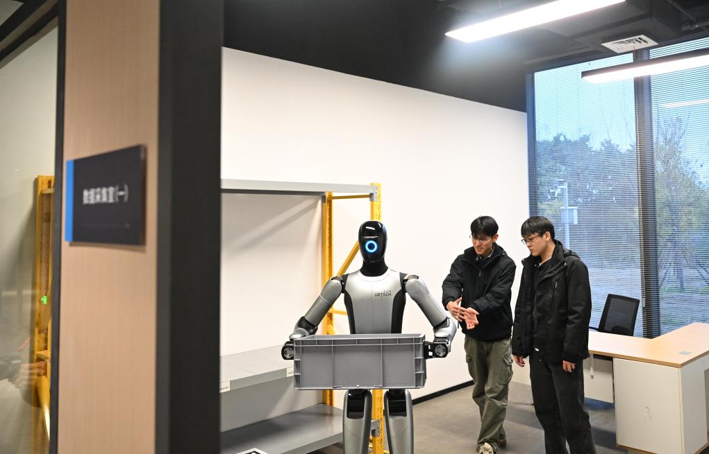 【新華社南寧2月23日】中国広西チワン族自治区柳州市のロボット産業パークでは、20代の訓練士が産業用人型ロボットに基本動作を学習させている。