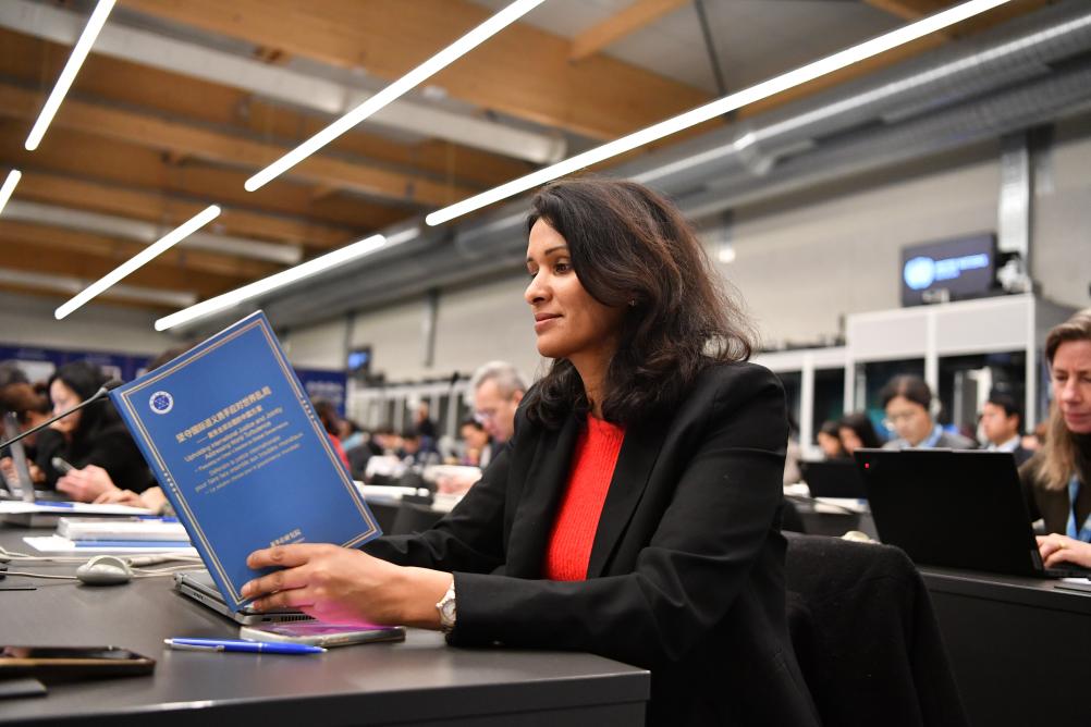24日、スイス・ジュネーブのパレ・デ・ナシオンで行われたシンクタンク報告書の発表会で、報告書を読む出席者。(ジュネーブ=新華社記者/連漪)