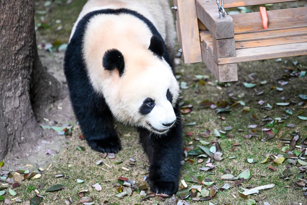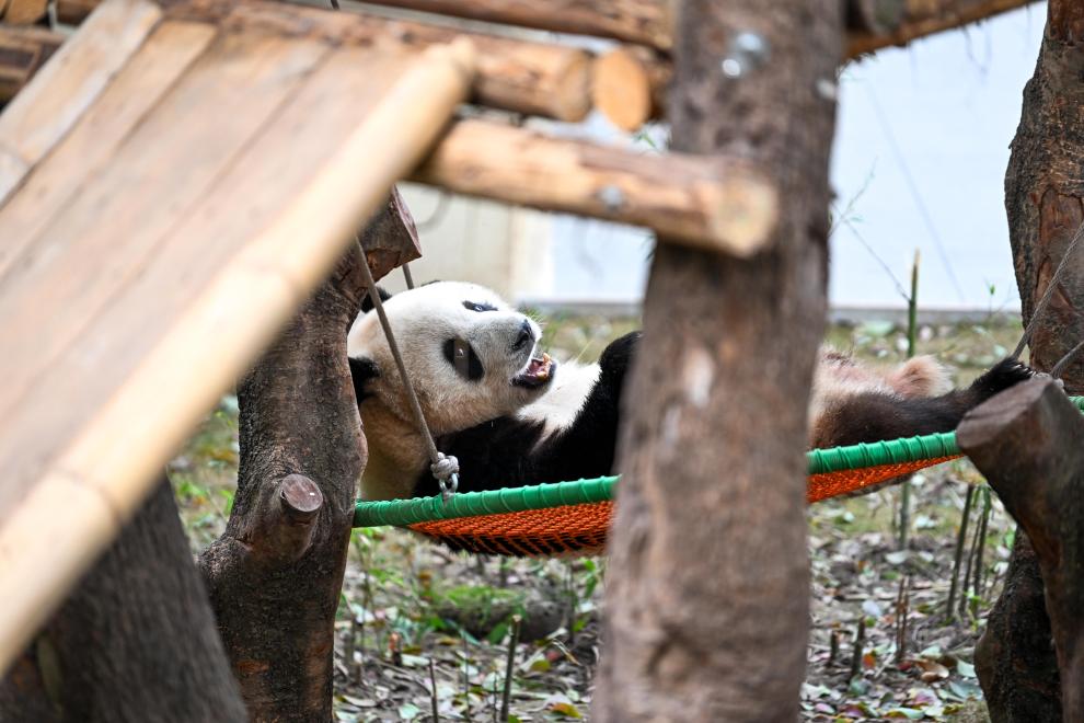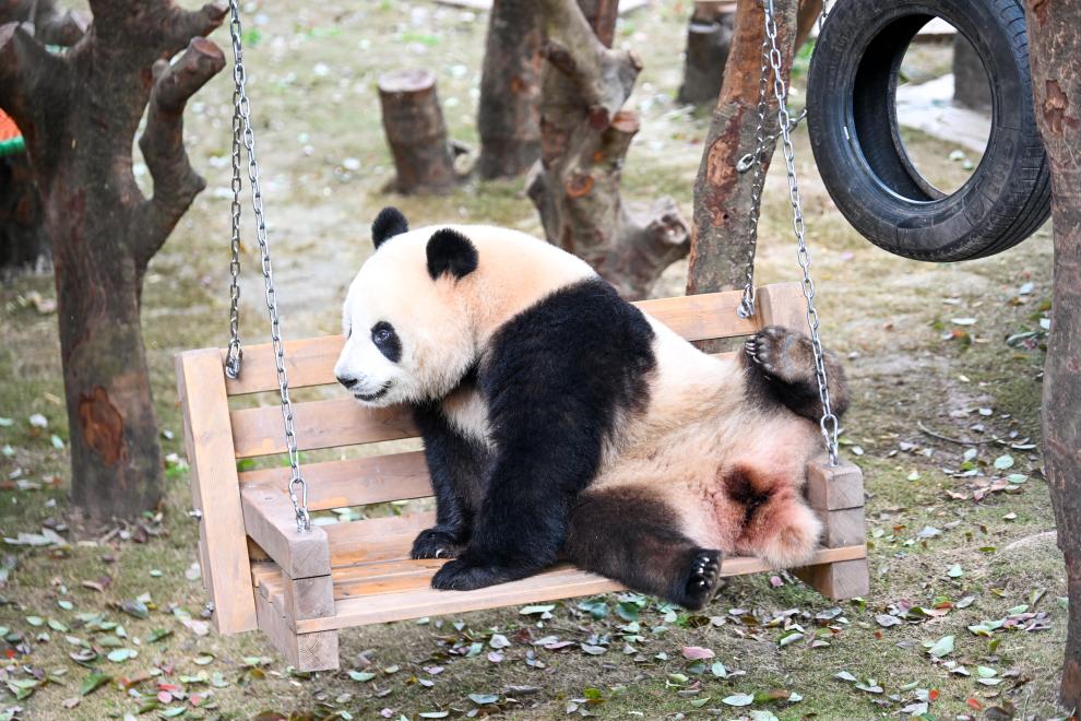 24日、屋外で遊ぶパンダ。(重慶=新華社記者/唐奕)