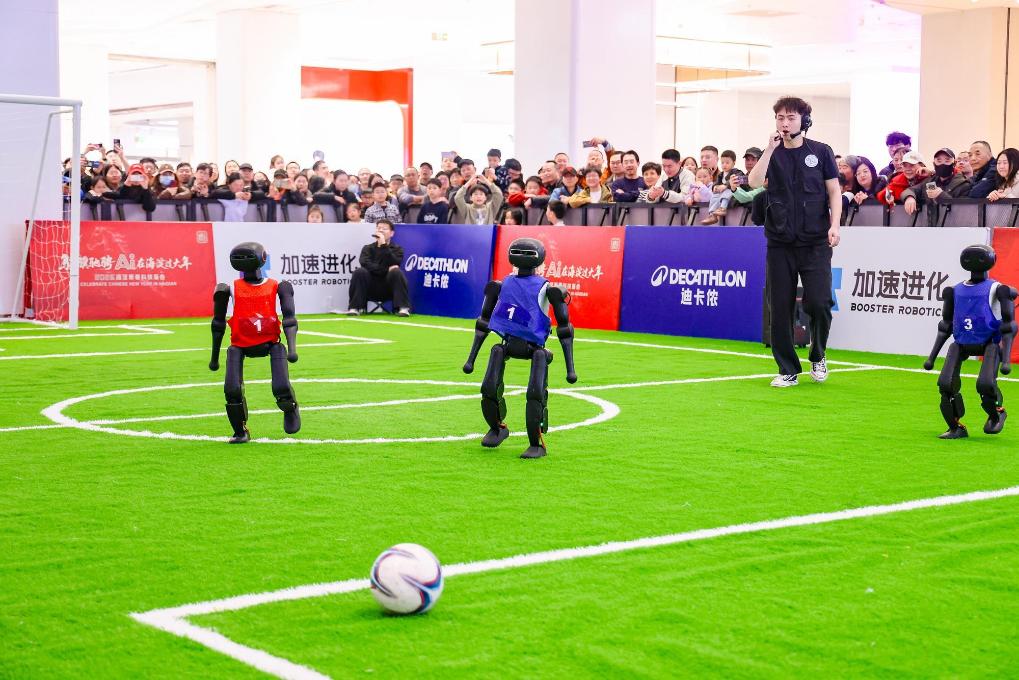 20日、海淀新春科学技術廟会で披露されたロボットによるサッカー試合。(北京=新華社配信)