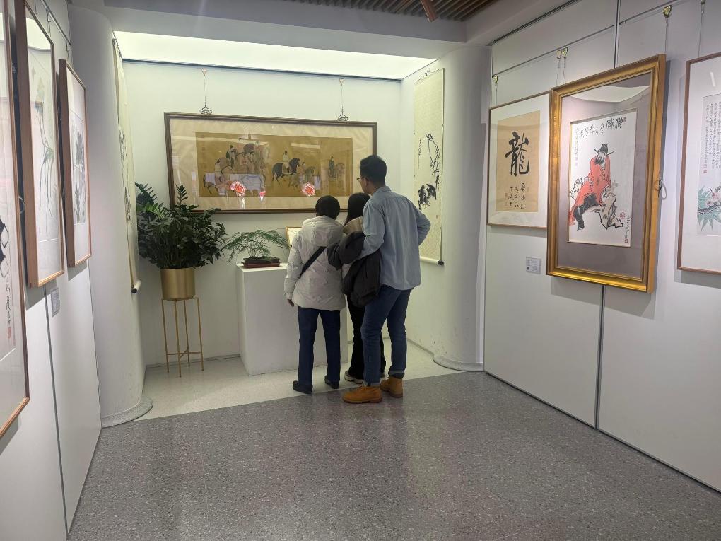 19日、瑠璃廠西街にある書画骨董の老舗「栄宝斎」に展示された作品を鑑賞する人々。(北京=新華社記者/常博深)