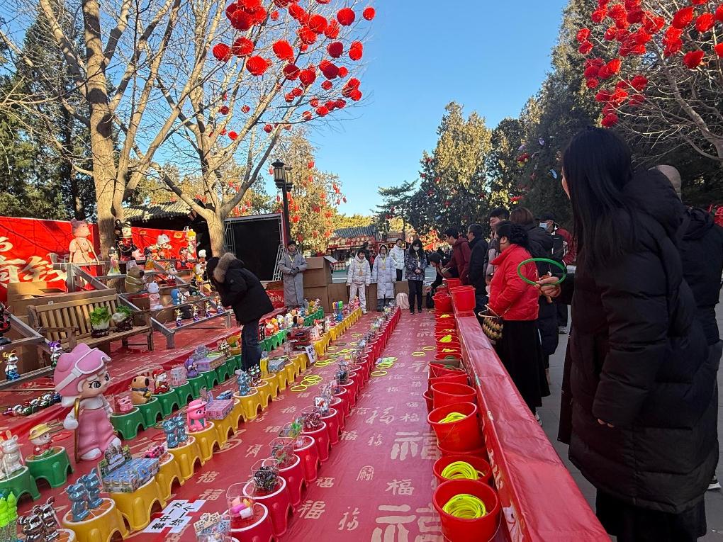 17日、地壇春節文化廟会で輪投げを楽しむ来場者。(北京=新華社記者/常博深)