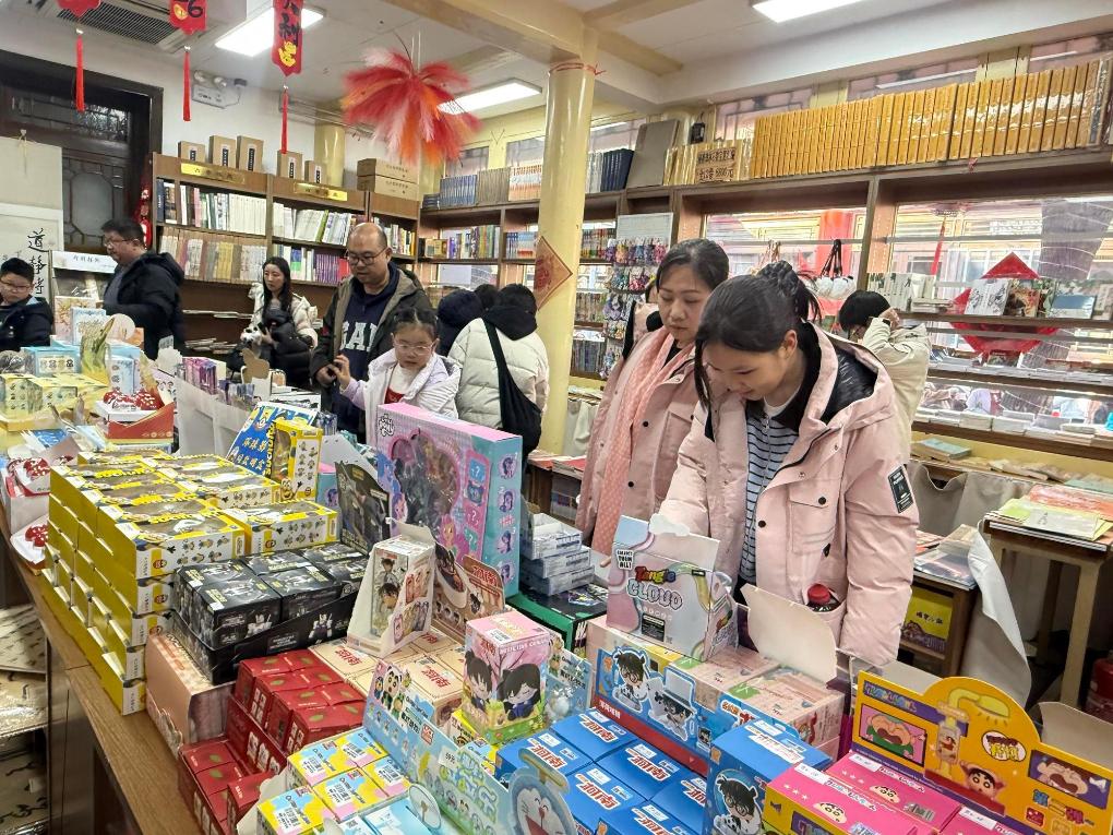 19日、琉璃廠文化街の老舗書店「中国書店」で文化関連商品を買い求める若者。(北京=新華社記者/常博深)