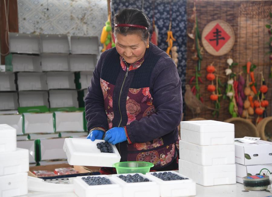 26日、北京市平谷区山東荘鎮魚子山村にある施設農業基地のハウスで収穫したばかりのブルーベリーを箱詰めするスタッフ。(北京=新華社記者/任超)