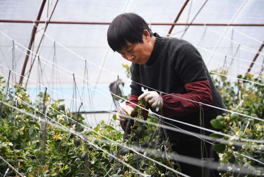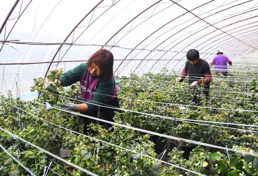 26日、北京市平谷区山東荘鎮魚子山村にある施設農業基地のハウス内でブルーベリーを管理するスタッフ。(北京=新華社記者/任超)