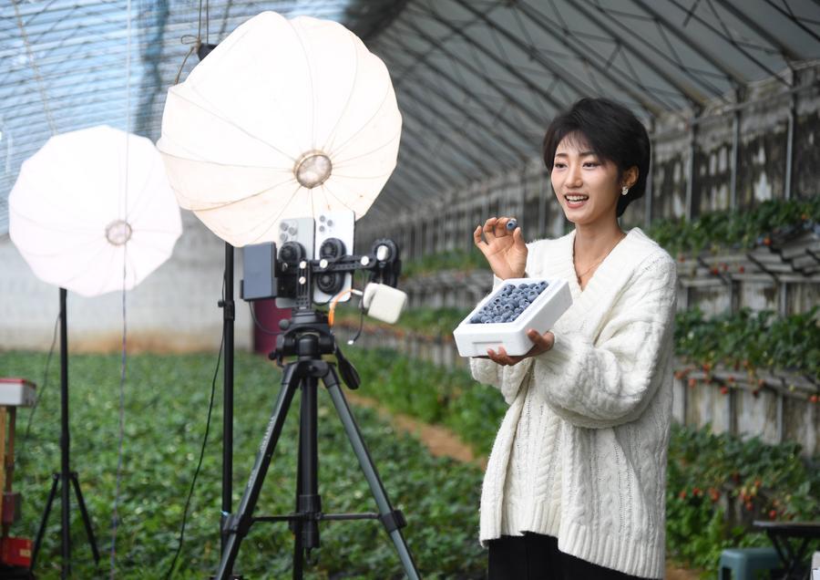 26日、北京市平谷区山東荘鎮魚子山村にある施設農業基地のハウス内でライブ配信を通じてブルーベリーを販売するスタッフ。(北京=新華社記者/任超)