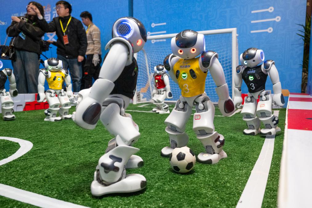 24日、会場でサッカーの試合に臨むロボット。(武漢=新華社記者/肖芸九)