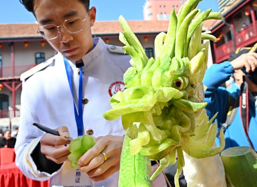 25日、食品彫刻の腕を披露する参加者。(青島=新華社記者/李紫恒)