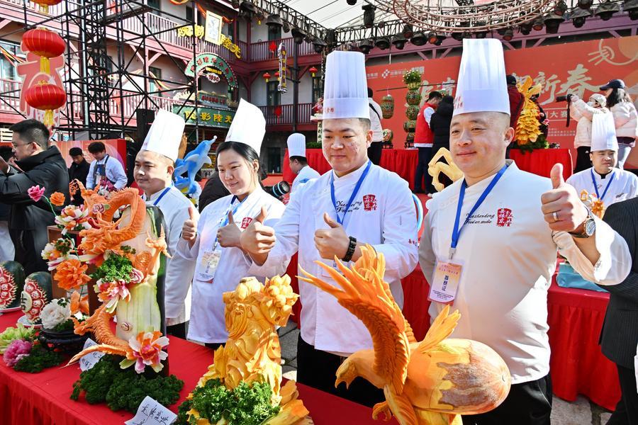 【新華社青島2月26日】中国山東省青島市の歴史建築を再生した文化エリア「広興里」で25日、「2026年青島ダイコン彫刻大会」が開催された。地元の飲食業界から30人余りの食品彫刻技師が参加し、ダイコンなどの食材を素材に彫刻の技を披露した。