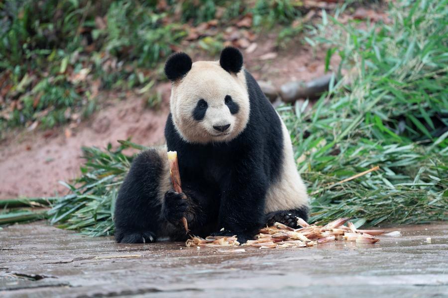 【新華社雅安2月27日】中国四川省雅安市にある中国ジャイアントパンダ保護研究センター雅安碧峰峡基地で、タケノコを握るパンダのシンシン(真真、中国名「仙女」)が撮影された。