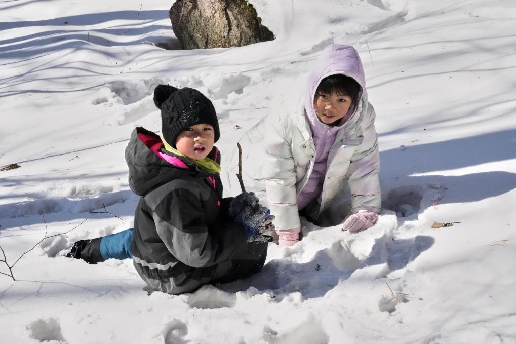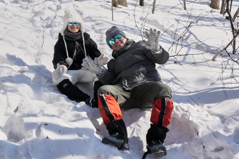 26日、黒竜江省鉄力市の林で雪遊びをする観光客。(伊春=新華社記者/王祚)