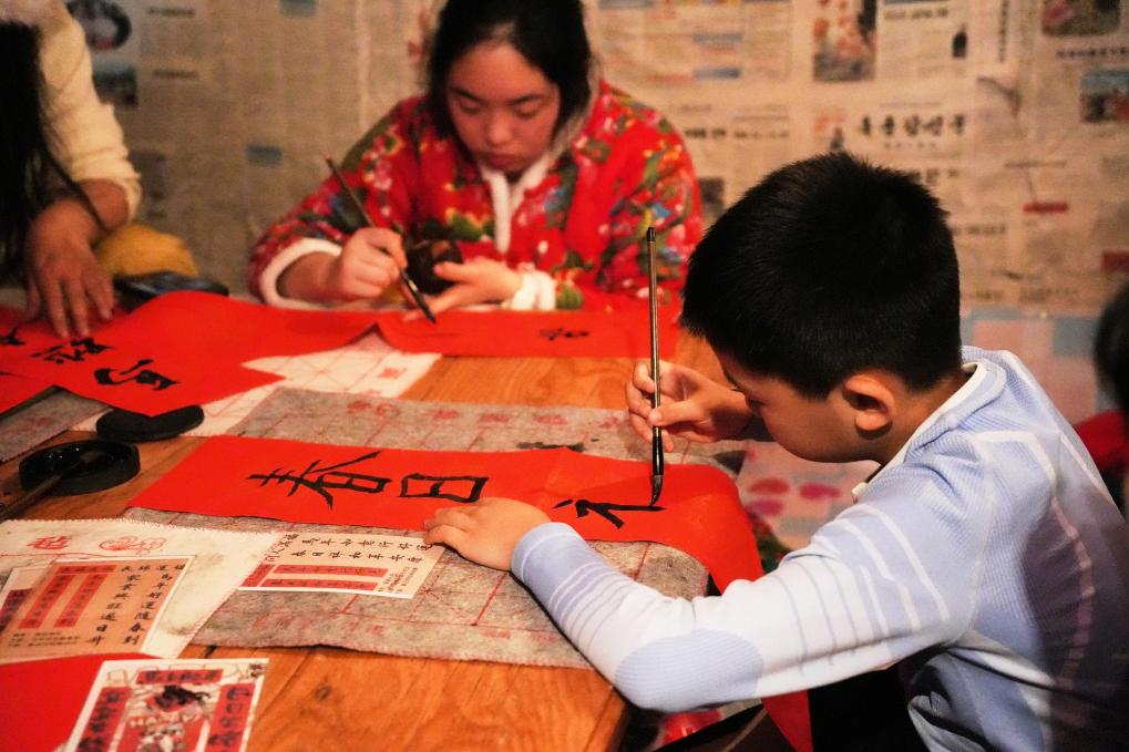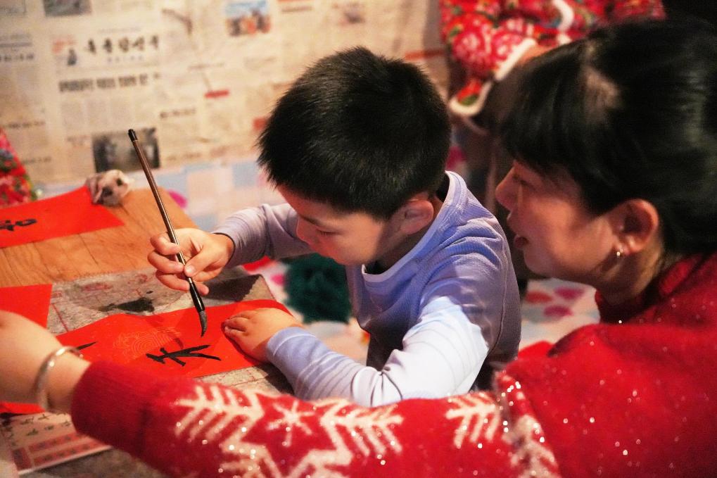 25日、黒竜江省鉄力市の農家で書道を体験する観光客。(伊春=新華社記者/王祚)