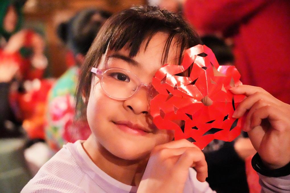 25日、黒竜江省鉄力市の農家で完成した「窓花」(窓に貼る切り絵)を掲げる観光客。(伊春=新華社記者/王祚)