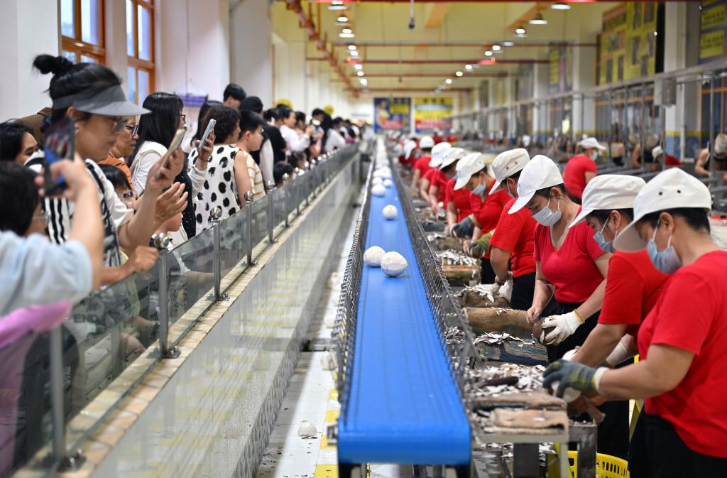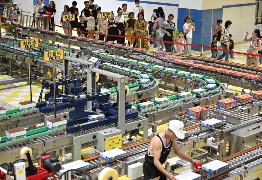 27日、地元飲料メーカー椰樹集団の工場を見学する市民や観光客。(海口=新華社記者/郭程)
