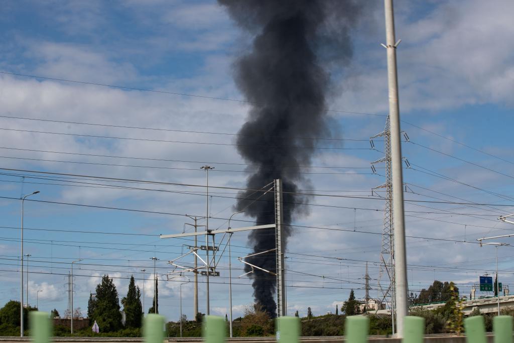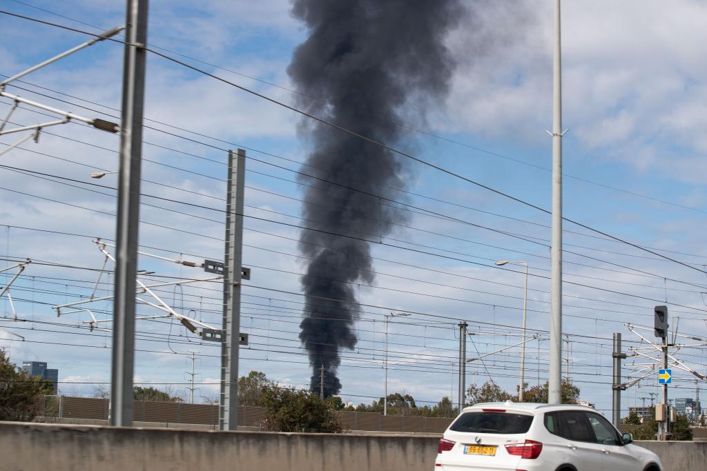 28日、イスラエル・テルアビブに立ち上る黒煙。(テルアビブ=新華社記者/陳君清)