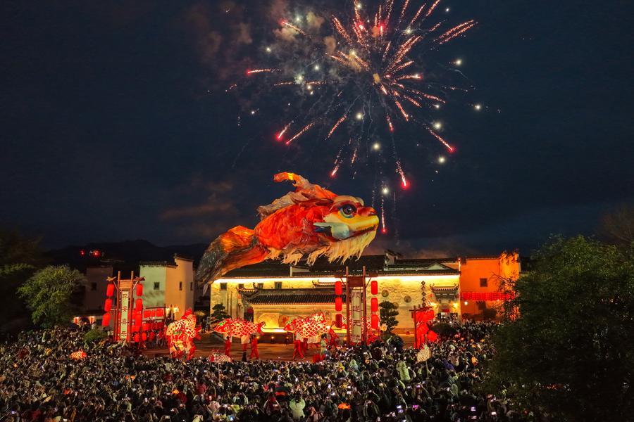 2月27日、唐模古村で「魚灯」のパフォーマンスを観賞する観光客。(黄山=新華社記者/杜宇)