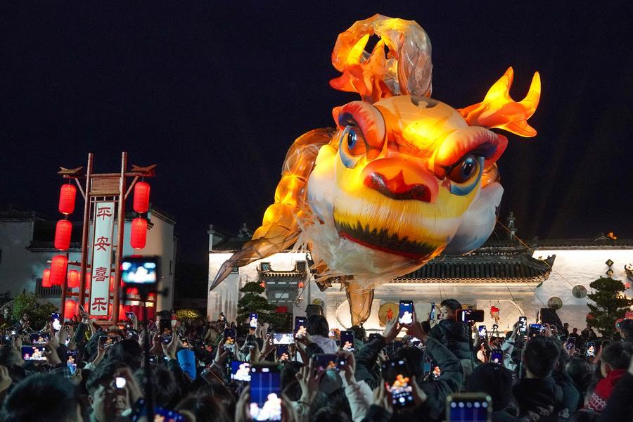 【新華社黄山3月1日】中国安徽省黄山市徽州区の唐模古村で2月27日、無形文化遺産で魚の形をしたランタン「魚灯」を観賞するイベントが開催された。巨大なランタンが銅鑼や太鼓の音色に合わせて空へふわりと浮かび上がると、多くの観光客や市民が足を止めて見物し、写真に収めた。
