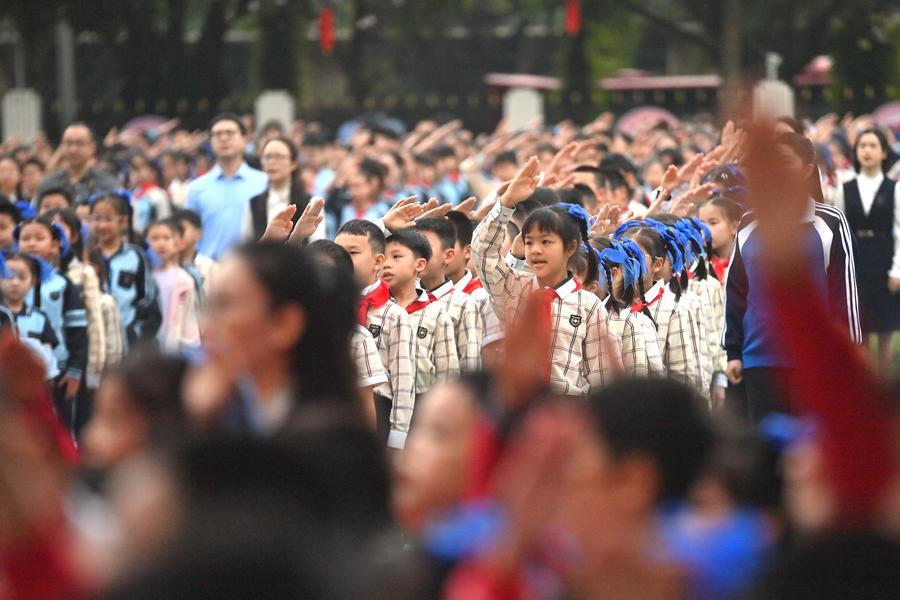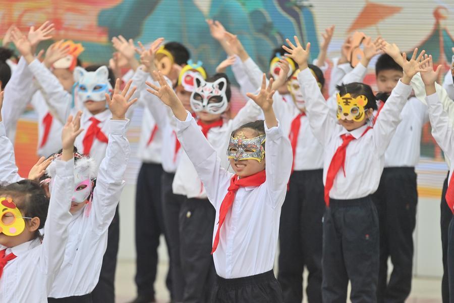 2日、広西チワン族自治区南寧市の濱湖路小学校の始業式で、パフォーマンスを披露する子どもたち。(南寧=新華社記者/黄孝邦)