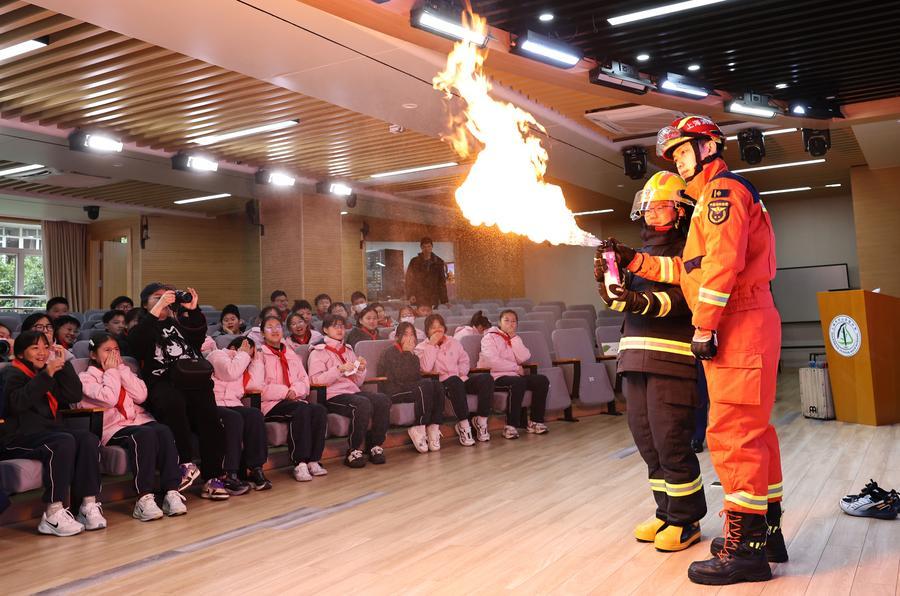 2日、上海市の天山中学校で、消防安全講習を受ける生徒たち。(上海=新華社記者/方喆)