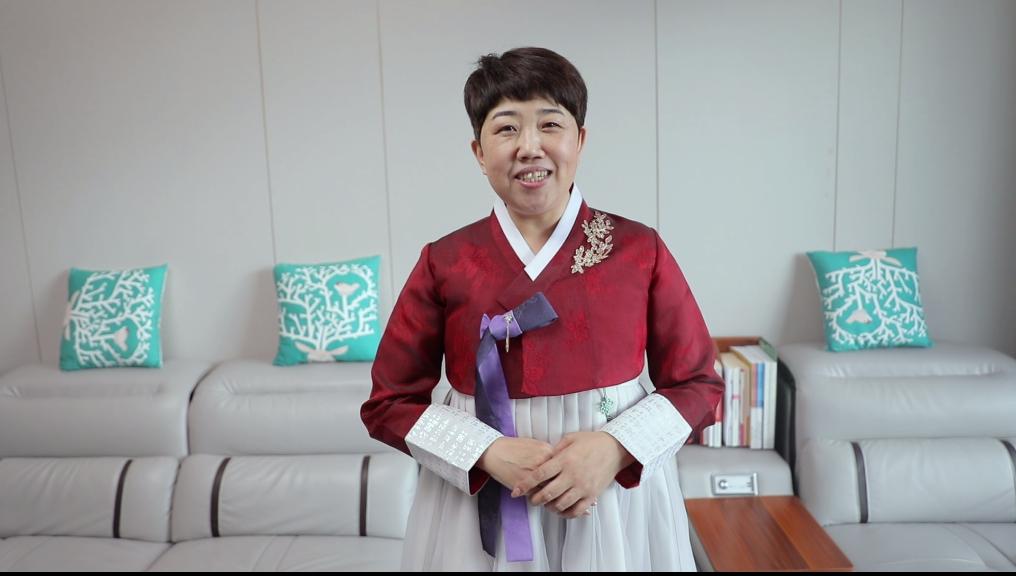 2月23日、朝鮮族の民族衣装を着て自宅でインタビューに応じる玉明姫さん。(長春=新華社配信)