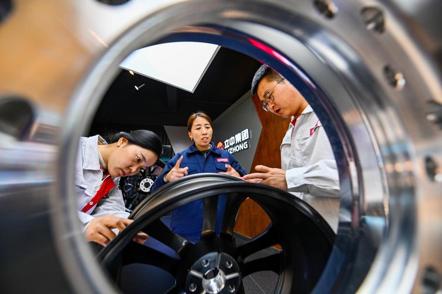 2月25日、天津立中車輪で従業員と交流する郭紅静さん(中央)。(天津=新華社記者/李然)