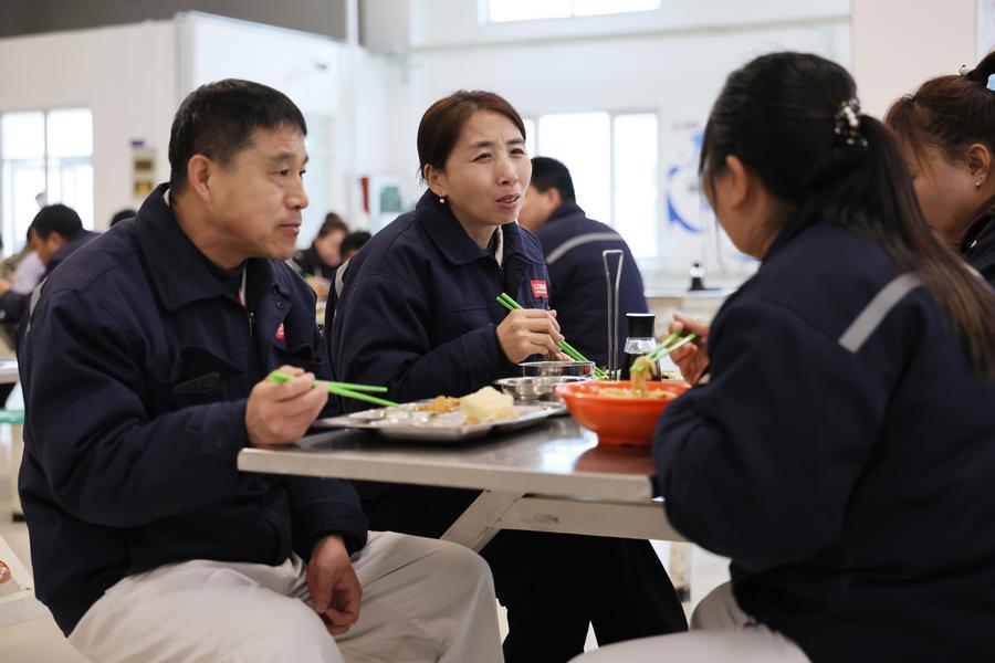 2月25日、天津立中車輪の従業員寮で昼休みを利用して従業員の提言を聞く郭紅静さん(左から2人目)。(天津=新華社記者/趙子碩)