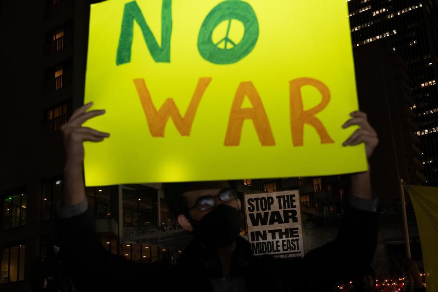 2日、米カリフォルニア州サンフランシスコで行われた集会で参加者が掲げた、イランへの軍事攻撃に抗議するプラカード。(サンフランシスコ=新華社配信/朱子于)