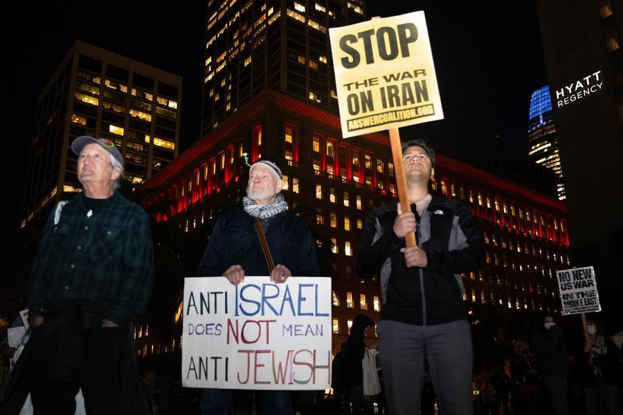 2日、米カリフォルニア州サンフランシスコで行われた集会に参加し、イランへの軍事攻撃に抗議する人々。(サンフランシスコ=新華社配信/朱子于)