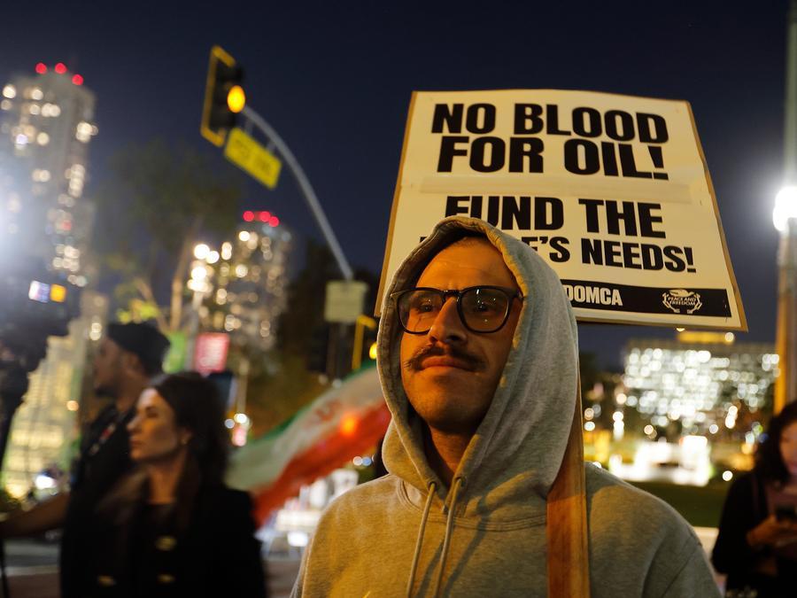 2日、米カリフォルニア州ロサンゼルスで行われた集会に参加し、イランへの軍事攻撃に抗議する人。(ロサンゼルス=新華社配信)