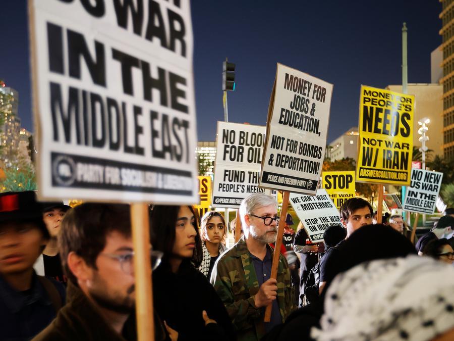 2日、米カリフォルニア州ロサンゼルスで行われた集会に参加し、イランへの軍事攻撃に抗議する人々。(ロサンゼルス=新華社配信)