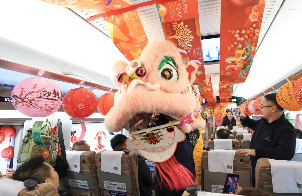 【新華社チチハル3月3日】中国黒竜江省の鉄道を管理、運営する中国鉄路ハルビン局集団のチチハル客運段(運輸区)が運行するチチハル南駅発天津西駅行きの高速列車の車内で、旧暦1月15日の元宵節(今年は3月3日)を前にテーマイベント「元宵を楽しみ、団らんを語る」が行われた。