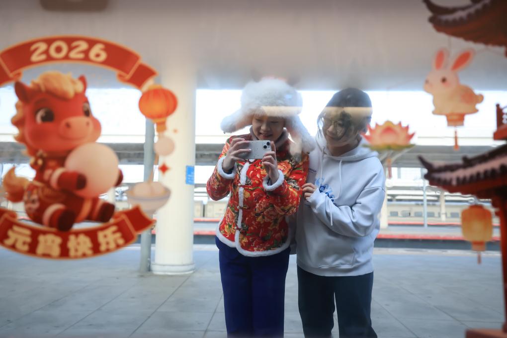 1日、チチハル駅のホームで、列車の元宵節飾りを撮影する乗客。(チチハル=新華社配信/徐率)