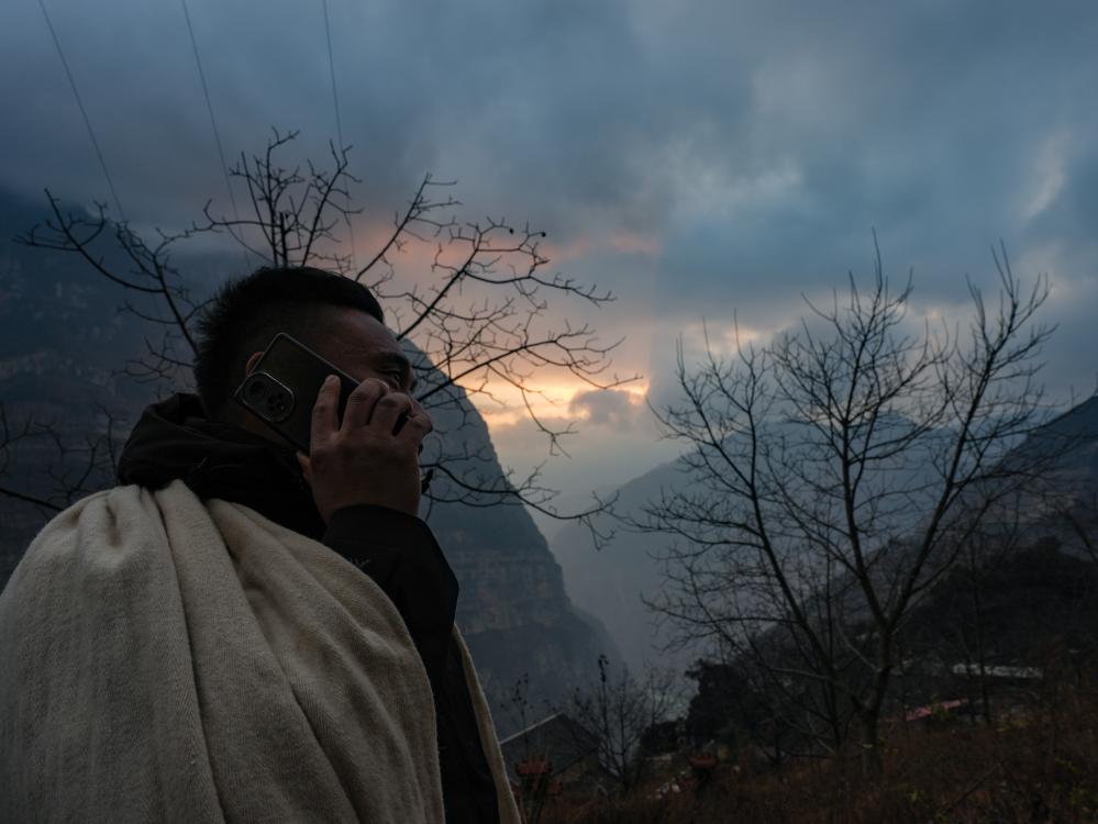 古路村の事務所で、村民と電話で話をする鄭望春さん。(1月28日撮影、雅安=新華社記者/王曦)