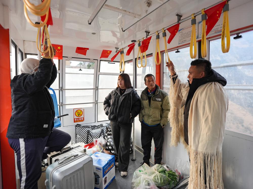 古路村のロープウエー内で、出稼ぎ先から帰郷した村民と交流する鄭望春さん(右)。(1月28日撮影、雅安=新華社記者/王曦)