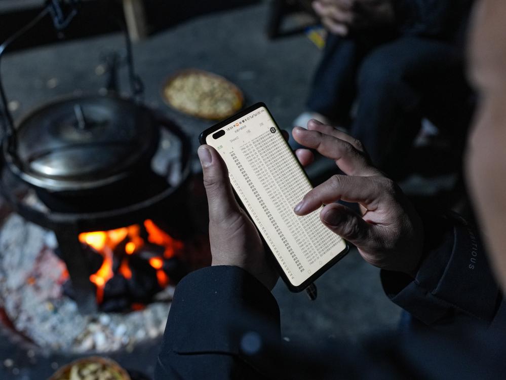 スマートフォンで村民の戸籍情報を確認する鄭望春さん。(1月28日撮影、雅安=新華社記者/王曦)