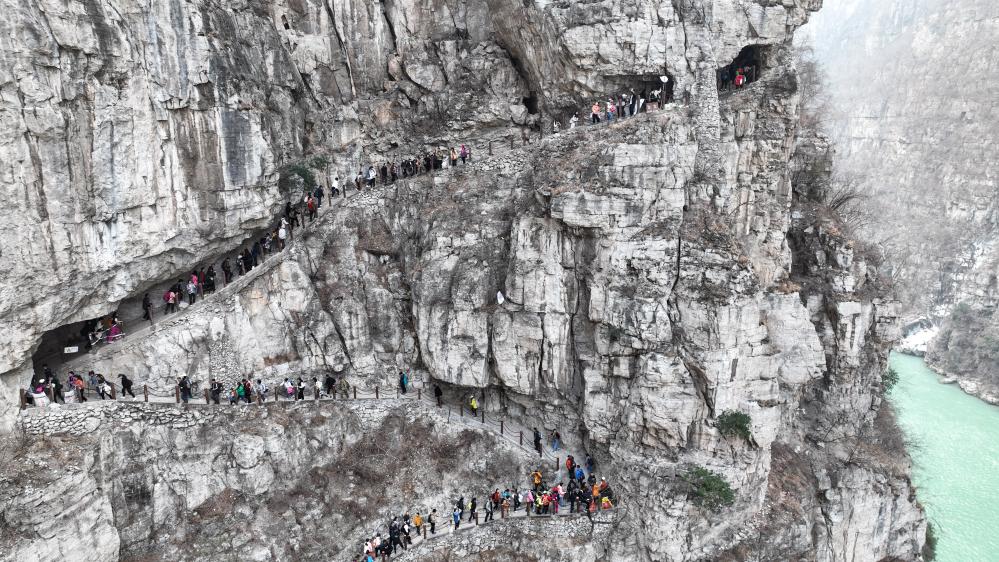 四川省漢源県永利イ族郷古路村で、「騾馬道」ウオーキングを体験する観光客。(2024年3月16日、ドローンから、雅安=新華社配信/張鴻鑫)