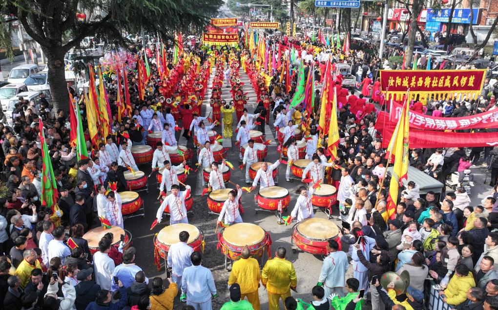 3日、河南省洛陽市汝陽(じょよう)県で、銅鑼や太鼓の演奏を見る人たち。(ドローンから、洛陽=新華社配信/康紅軍)