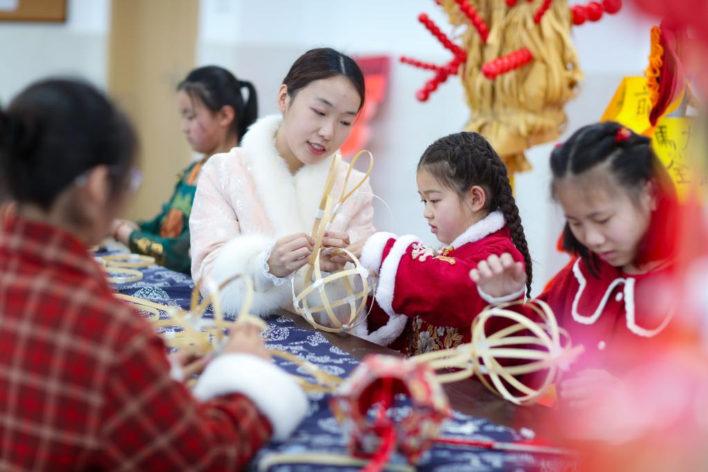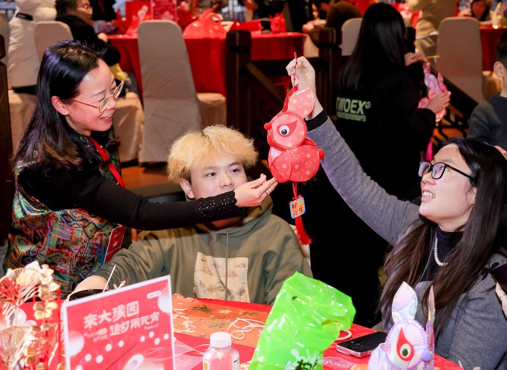 3日、江蘇省泰州市で、元宵節の花灯(飾りちょうちん)作りを体験する人たち。(泰州=新華社配信/周社根)