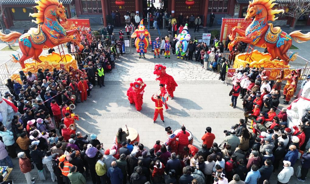 3日、河南省許昌市の灞陵橋(はりょうきょう)風景区で、獅子舞を見る人たち。(ドローンから、許昌=新華社配信/牛書培)