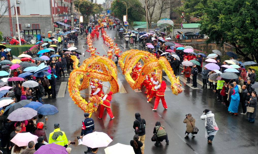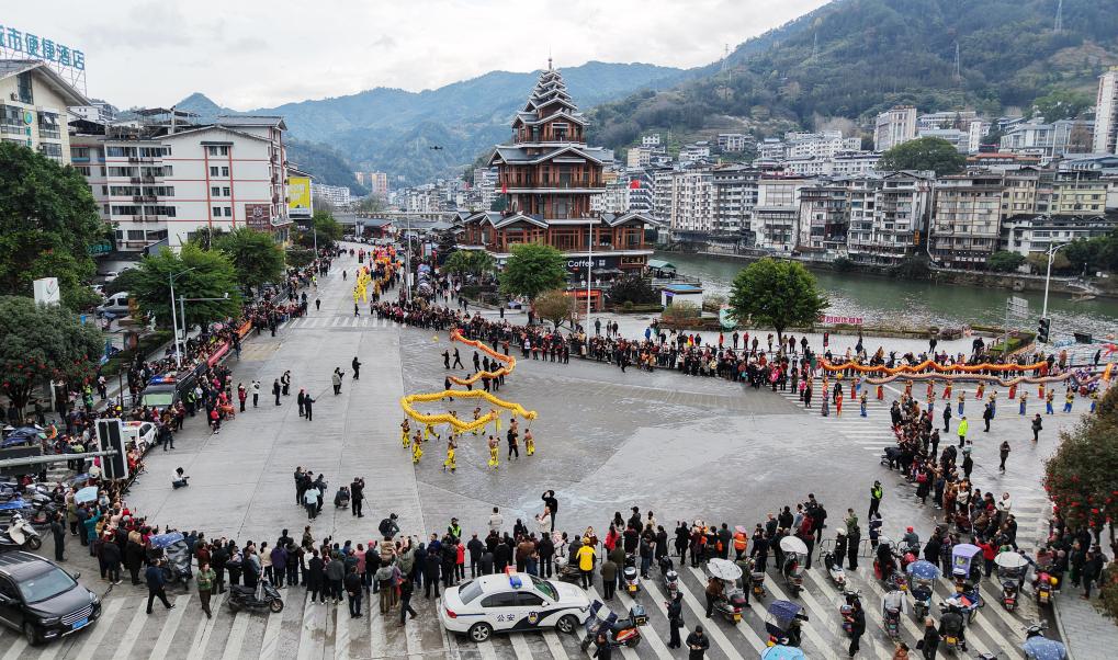 3日、広西チワン族自治区竜勝各族自治県で披露された竜舞。(ドローンから、竜勝=新華社配信/韋吉陽)