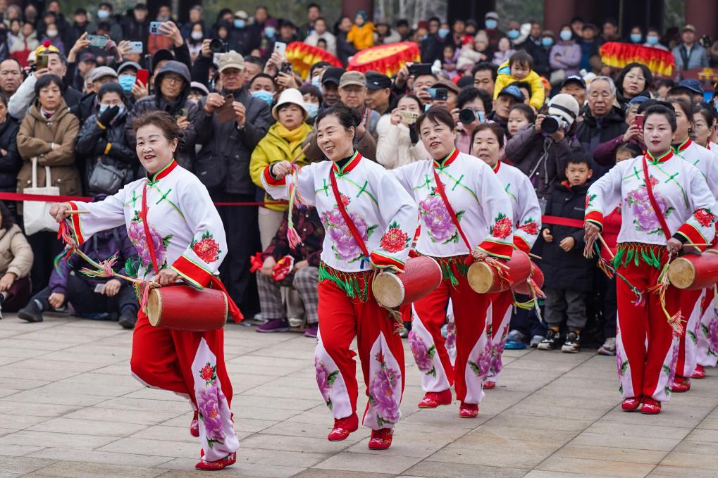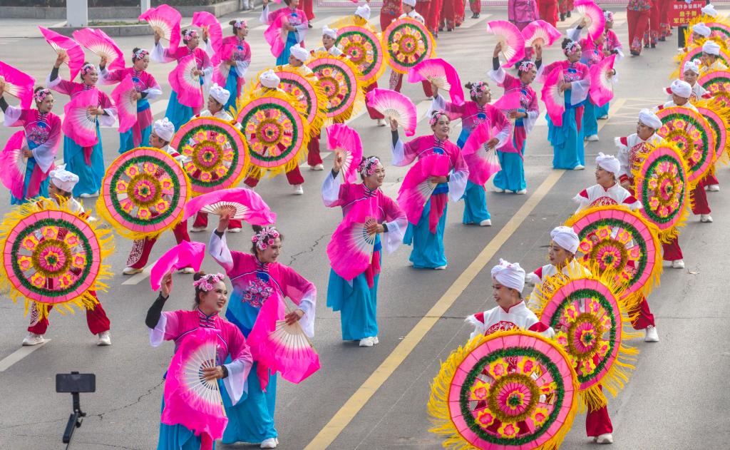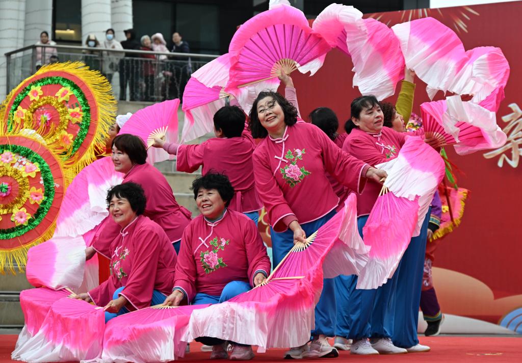 3日、山東省済南市で披露された伝統舞踊「花棍舞」。(済南=新華社記者/朱崢)