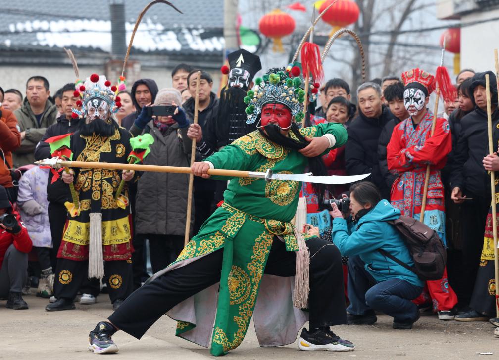 3日、河南省焦作市で披露された無形文化遺産の伝統舞踊「高抬火轎(こうたいかきょう)」。(焦作=新華社配信/楊帆)