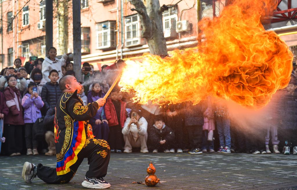 3日、河南省洛陽市で披露された口から炎を吐くパフォーマンス「吐火」。(洛陽=新華社配信/黄政偉)