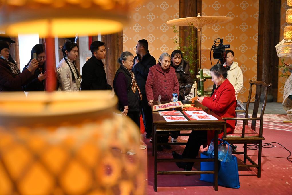3日、福建省福州市の歴史文化街区「三坊七巷」で、剪紙(せんし、切り絵細工)を披露する職人(手前右端)。(福州=新華社記者/林善伝)